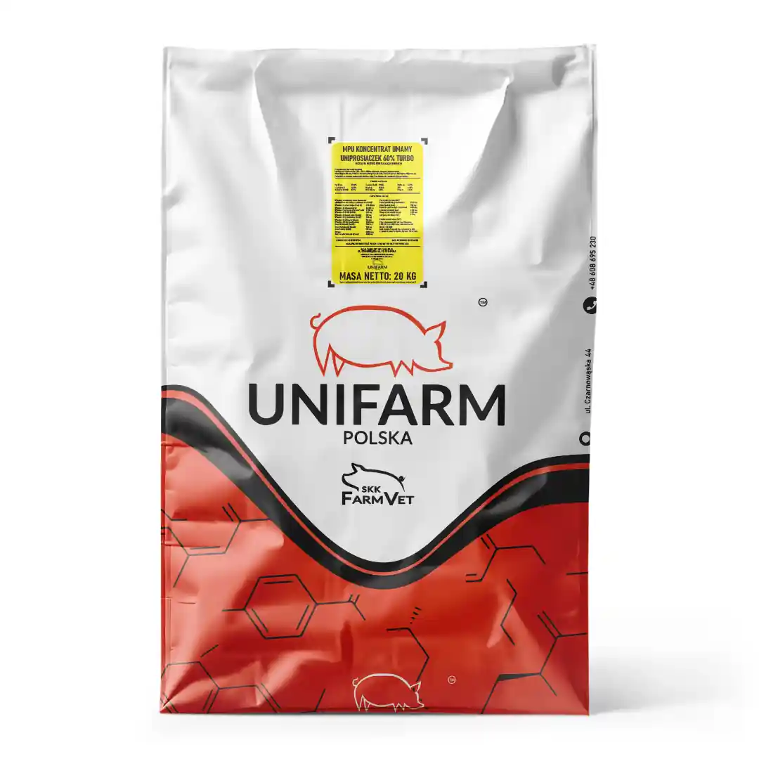 MPU Koncentrat Uniprosiaczek Turbo Umamy 60% – prestarter od porodówki oraz pasza odsadzeniowa w systemie 60/40 z jęczmieniem. Rdzeń stanowią serolaty, roślinne tłuszcze nasycone (olej kokosowy o wysokiej zawartości kwasu laurynowego oraz palmowy), a także białko klasy premium (mączka rybna, HP300). Wersję wzbogacono o umam (mączkę owadzią), która poprawia smakowitość i dostarcza dodatkowej energii. Zbalansowany profil AA sprzyja wysokim przyrostom, niskiej konwersji (FCR) i bezpiecznemu odchowowi.