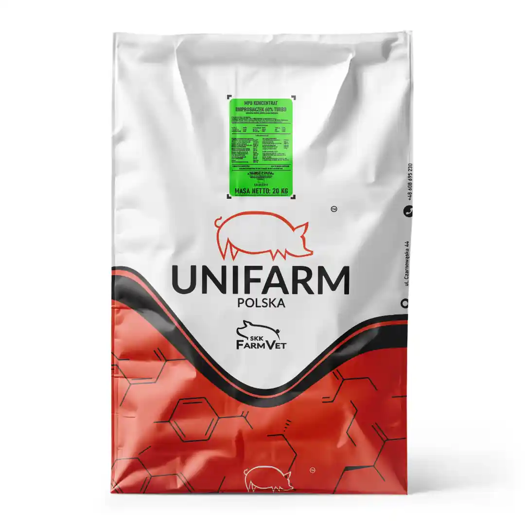 MPU Koncentrat Uniprosiaczek 60% Turbo – prestarter dla prosiąt od porodówki oraz pasza odsadzeniowa w systemie 60/40. Wysokostrawne produkty mlekopochodne (serolaty), roślinne tłuszcze nasycone (olej kokosowy o wysokiej zawartości kwasu laurynowego oraz palmowy), białko klasy premium (mączka rybna, HP300) i kompleks enzymatyczny przekładają się na chętny pobór, wysoki poziom energii użytecznej i niski FCR. Wystarczy dodać 40% jęczmienia, aby uzyskać gotową paszę o profilu AA zbliżonym do „białka idealnego”.